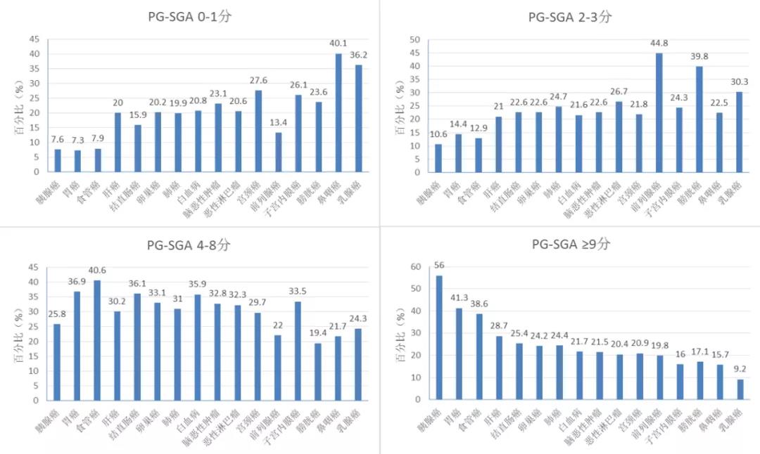 圖2 常見惡性腫瘤不同PG-SGA評分患者所占比例