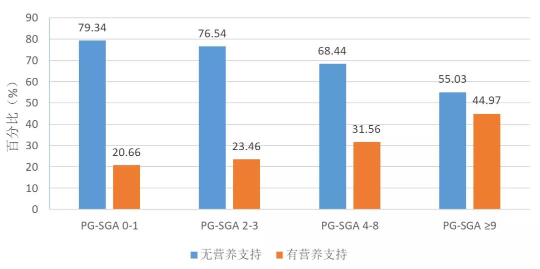 該研究結(jié)果顯示我國腫瘤患者營養(yǎng)不良的發(fā)病存在年齡、性別、腫瘤分期、治療情況、不同醫(yī)療保險類型、受教育水平、職業(yè)、居住地及地區(qū)差異:<45歲年齡組患者PG-SGA評分最低(4.84±4.50),≥70歲年齡組患者PG-SGA評分最高(7.82±5.10);女性肺癌(5.87 vs. 5.60,P=0.006)和胃癌(8.36vs. 7.81,P<0.001) PG-SGA評分高于男性;TNM分期較高的患者其PG-SGA評分也較高;接受手術(shù)治療的患者PG-SGA評分最高(6.22±4.74),而目前還沒有接受任何治療的患者評分最低(5.61±4.68);華中區(qū)域PG-SGA評分最低(4.82±4.16),華東區(qū)域PG-SGA評分最高(7.31±5.53)。上消化道、老年、農(nóng)民、低教育水平、手術(shù)、進展期腫瘤患者是營養(yǎng)不良高風險人群,也應該是營養(yǎng)治療的重點人群。中國常見惡性腫瘤患者營養(yǎng)不良發(fā)生率較高,而臨床營養(yǎng)治療率低。研究發(fā)現(xiàn)有68.8%的患者沒有獲得任何營養(yǎng)治療。值得注意的是,即使在重度營養(yǎng)不良組患者中,無營養(yǎng)治療率仍然高達55.03%(圖3)。獲得營養(yǎng)治療的患者中,14.64%的患者接受了腸外營養(yǎng)治療,9.05%的患者接受了腸內(nèi)營養(yǎng)治療,僅有7.53%接受了腸內(nèi)腸外聯(lián)合營養(yǎng)治療。而沒有營養(yǎng)不良的患者卻有20.66%接受了營養(yǎng)治療。