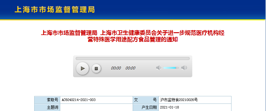 2021年1月18日,上海市市場監(jiān)督管理局聯(lián)合上海市衛(wèi)健委發(fā)布了關于進一步規(guī)范醫(yī)療機構經營特殊醫(yī)學用途配方食品管理的通知。