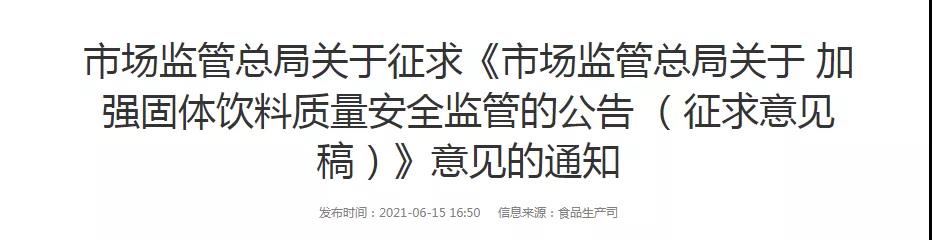 為進(jìn)一步加強(qiáng)固體飲料質(zhì)量安全監(jiān)管,督促落實(shí)企業(yè)食品安全主體責(zé)任,保障消費(fèi)者食品安全和合法權(quán)益,市場(chǎng)監(jiān)管總局起草了《市場(chǎng)監(jiān)管總局關(guān)于加強(qiáng)固體飲料質(zhì)量安全監(jiān)管的公告(征求意見稿)》,現(xiàn)向社會(huì)公開征求意見。歡迎各有關(guān)單位和個(gè)人提出修改意見,并于2021年7月14日前反饋市場(chǎng)監(jiān)管總局。