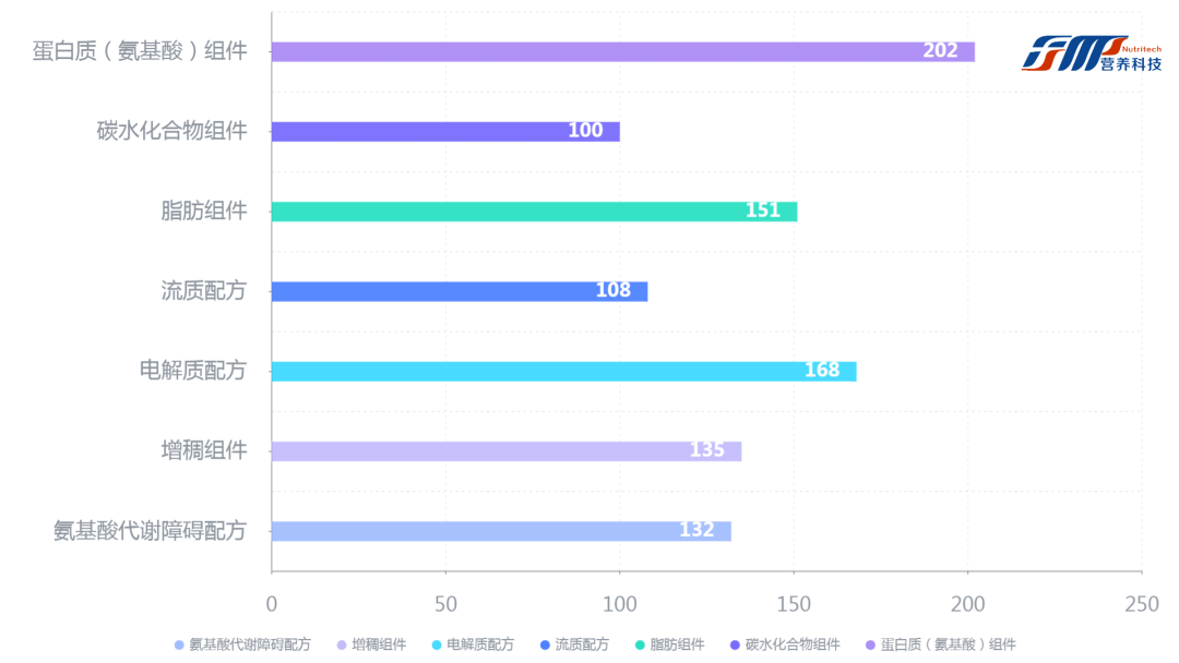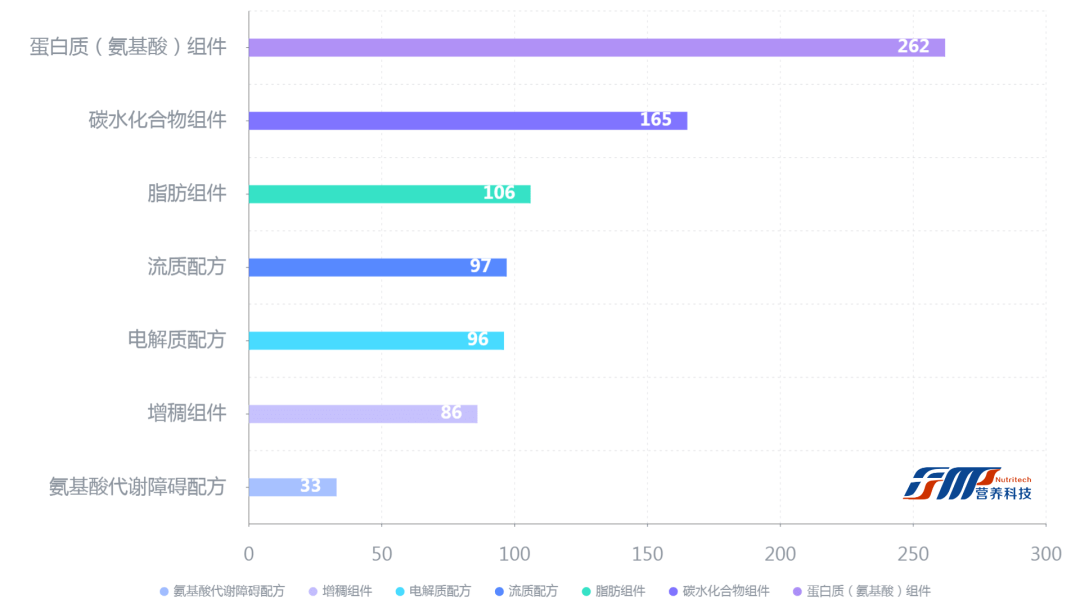 圖 2 各醫(yī)院已獲得 FSMP 注冊(cè)批號(hào)的產(chǎn)品數(shù)量及分布?散點(diǎn)圖固體/ 液體飲料供給情況:( n=364 )共有 364 家 醫(yī) 院 有 固 體/液 體 飲 料。其 中 334 家(91.8%) 醫(yī)院有類(lèi)全營(yíng)養(yǎng)配方食品,292 家 (80.2 % )醫(yī)院有類(lèi)特定全營(yíng)養(yǎng)配方食品;287家(78.8%)醫(yī)院有類(lèi)非全營(yíng)養(yǎng)配方食品。同時(shí)擁有3 種類(lèi)型固體/ 液體飲料的醫(yī)院占比最高(233家,64.0%)。醫(yī)院覆蓋面前五位的疾病專用型固體/液體飲料分別為糖尿病、腎病、胃腸道吸收障礙、 胰腺炎、腫瘤、肝?。▓D 3 醫(yī)院覆蓋前三位的組件型固體/液體飲料分別為蛋白質(zhì)(氨基酸)組件、碳水化合物組件、脂肪(脂肪酸) 組件(圖4)。