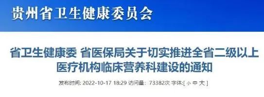10月17日,貴州省衛(wèi)生健康委正式發(fā)布了《關(guān)于切實(shí)推進(jìn)全省二級以上醫(yī)療機(jī)構(gòu)臨床營養(yǎng)科建設(shè)的通知》,全省二級以上醫(yī)院逐步開始新增臨床營養(yǎng)科。