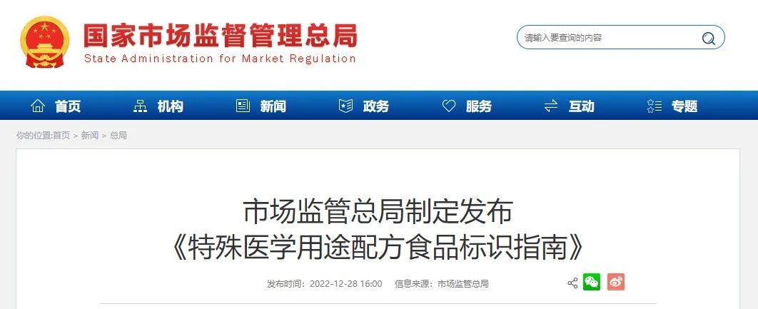 根據(jù)《中華人民共和國食品安全法》《特殊醫(yī)學用途配方食品注冊管理辦法》等法律法規(guī),市場監(jiān)管總局組織制定了《特殊醫(yī)學用途配方食品標識指南》,現(xiàn)予以公告。
