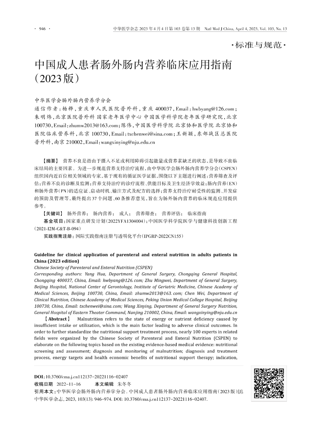 為推動(dòng)我國(guó)腸外腸內(nèi)營(yíng)養(yǎng)的臨床規(guī)范應(yīng)用,促進(jìn)學(xué)術(shù)進(jìn)步,由中華醫(yī)學(xué)會(huì)腸外腸內(nèi)營(yíng)養(yǎng)學(xué)分會(huì)(CSPEN)主導(dǎo)編撰的《中國(guó)成人患者腸外腸內(nèi)營(yíng)養(yǎng)臨床應(yīng)用指南(2023版)》于2023年4月4日正式發(fā)表于《中華醫(yī)學(xué)雜志》。