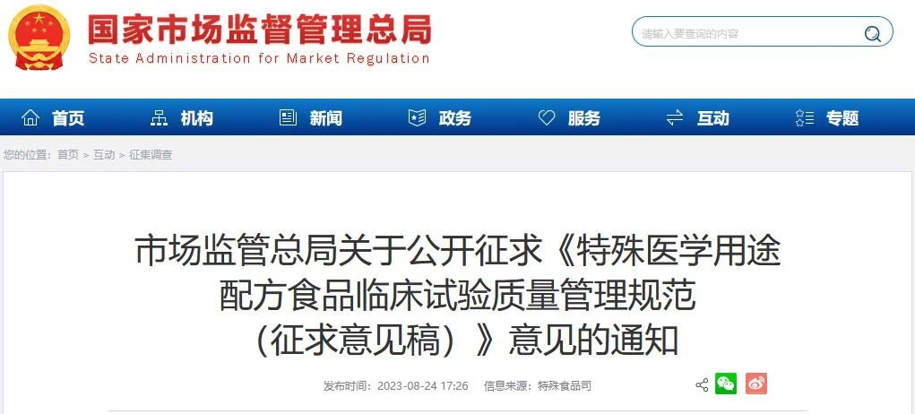 為進(jìn)一步提高特殊醫(yī)學(xué)用途配方食品臨床試驗(yàn)的科學(xué)性和可操作性,市場(chǎng)監(jiān)管總局組織起草了《特殊醫(yī)學(xué)用途配方食品臨床試驗(yàn)質(zhì)量管理規(guī)范(征求意見(jiàn)稿)》,現(xiàn)向社會(huì)公開(kāi)征求意見(jiàn),請(qǐng)于2023年9月24日前反饋市場(chǎng)監(jiān)管總局。公眾可通過(guò)以下途徑和方式提出意見(jiàn):一、通過(guò)登錄國(guó)家市場(chǎng)監(jiān)督管理總局官方網(wǎng)站(網(wǎng)址:http://www.samr.gov.cn),在首頁(yè)“互動(dòng)”欄目中的“征集調(diào)查”提出意見(jiàn)。二、通過(guò)電子郵件發(fā)送至tsspsypzcc@samr.gov.cn,郵件主題請(qǐng)注明“特殊醫(yī)學(xué)用途配方食品臨床試驗(yàn)質(zhì)量管理規(guī)范公開(kāi)征求意見(jiàn)”。三、通過(guò)信函郵寄至北京市西城區(qū)展覽路北露園1號(hào)市場(chǎng)監(jiān)管總局特殊食品司(郵政編碼:100037),并在信封上注明“特殊醫(yī)學(xué)用途配方食品臨床試驗(yàn)質(zhì)量管理規(guī)范公開(kāi)征求意見(jiàn)”字樣。
