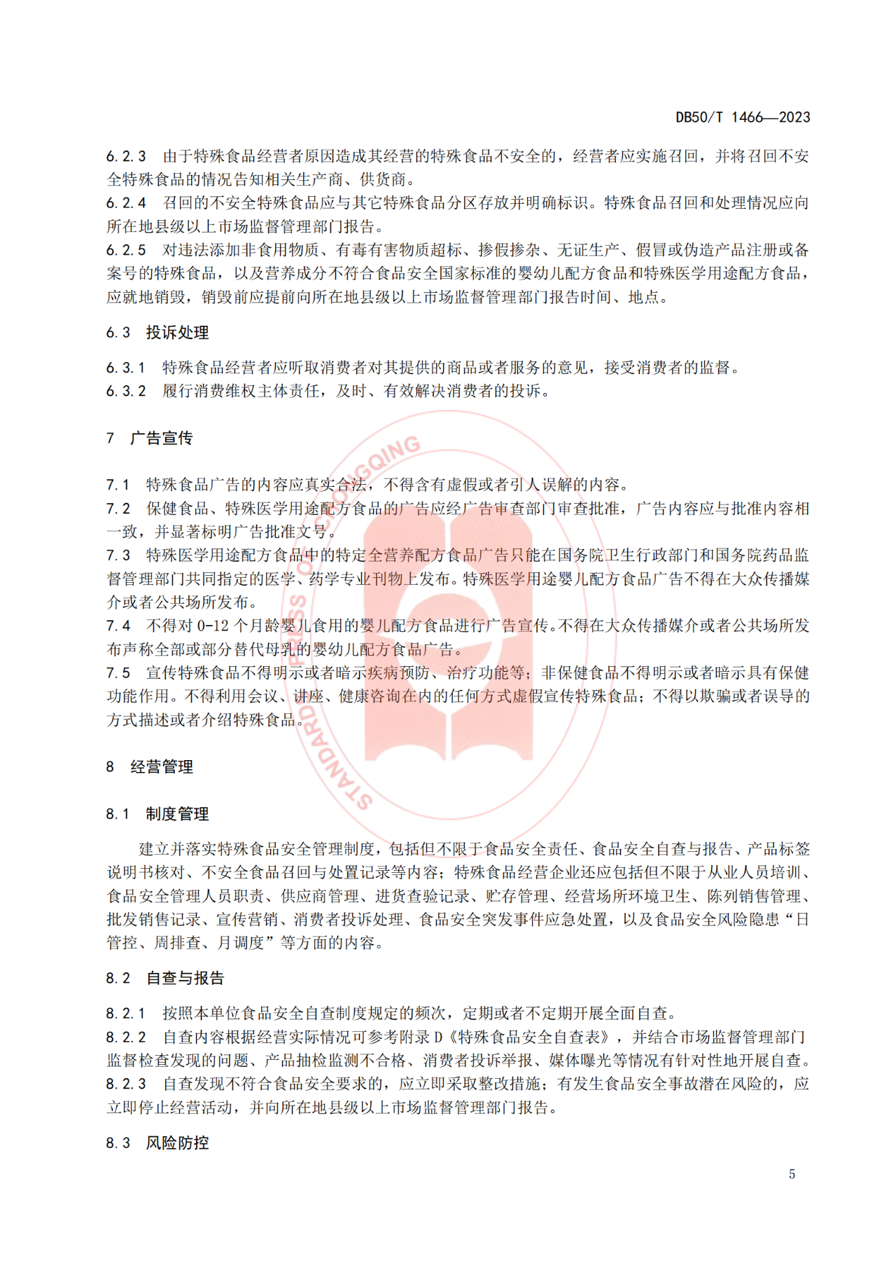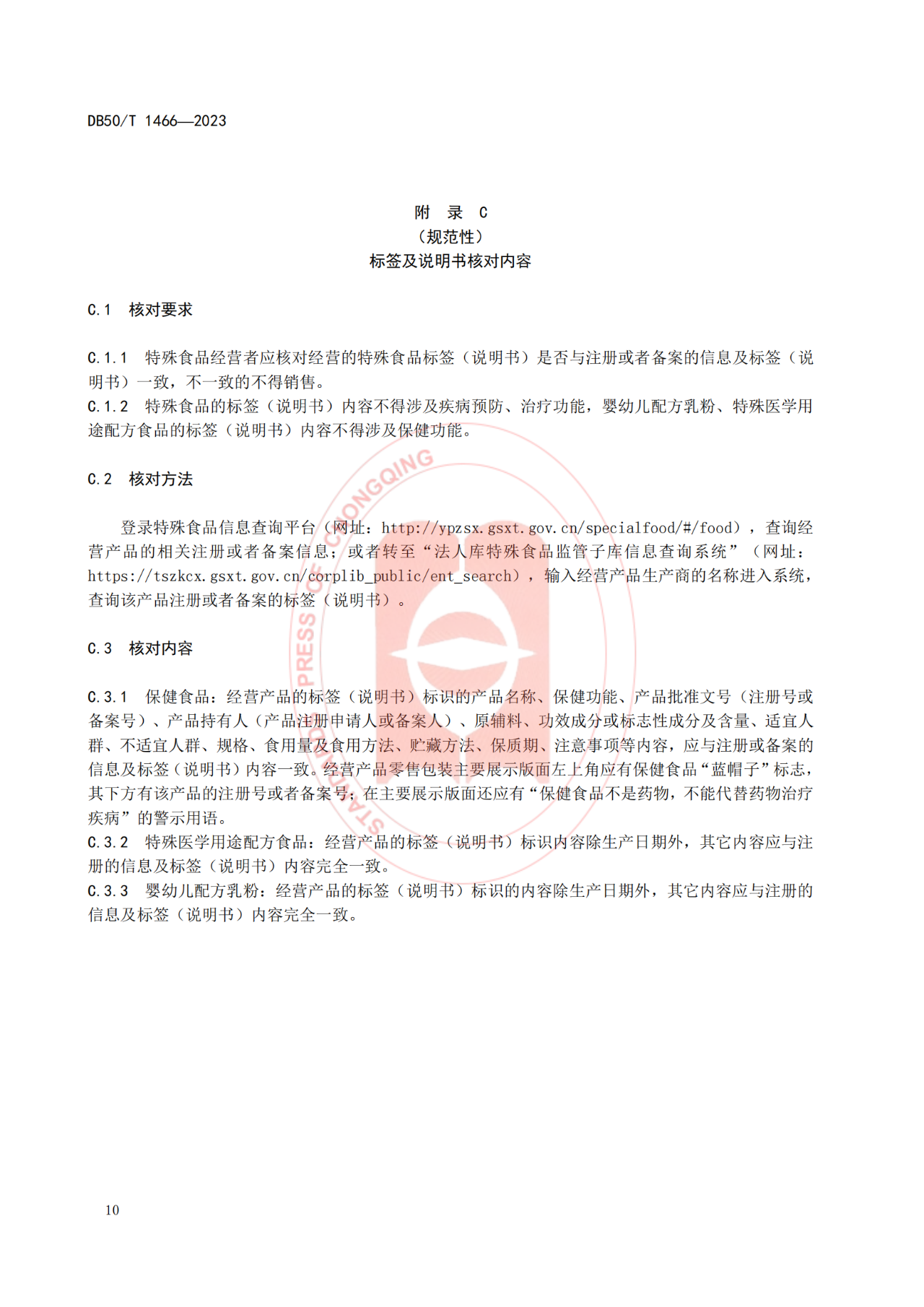 2023年10月12日,重慶市市場(chǎng)監(jiān)管局召開(kāi)的重慶市地方標(biāo)準(zhǔn)第八十一號(hào)公告發(fā)布會(huì)上,發(fā)布了《特殊食品經(jīng)營(yíng)規(guī)范》地方標(biāo)準(zhǔn)。《特殊食品經(jīng)營(yíng)規(guī)范》共8章,明確了特殊食品經(jīng)營(yíng)者應(yīng)做、禁做的事情,應(yīng)達(dá)到經(jīng)營(yíng)資質(zhì)合法、場(chǎng)所條件達(dá)標(biāo)、人員管理嚴(yán)格、索證索票齊全、陳列銷售規(guī)范、應(yīng)急處置有效、營(yíng)銷宣傳合規(guī)、經(jīng)營(yíng)管理到位;嚴(yán)禁銷售標(biāo)簽、說(shuō)明書與注冊(cè)或者備案信息不一致的產(chǎn)品,嚴(yán)禁產(chǎn)品標(biāo)簽、說(shuō)明書中明示或者暗示具有預(yù)防、治療疾病功能,嚴(yán)禁特殊食品與普通食品或者藥品等其他商品混放銷售、三類產(chǎn)品之間混放銷售,嚴(yán)禁銷售超過(guò)保質(zhì)期的特殊食品,嚴(yán)禁網(wǎng)絡(luò)交易特定全營(yíng)養(yǎng)配方食品,嚴(yán)禁對(duì)0~12個(gè)月齡嬰兒食用的嬰兒配方食品進(jìn)行廣告宣傳,嚴(yán)禁在大眾傳播媒介或者公共場(chǎng)所發(fā)布全部或部分替代母乳的嬰幼兒配方食品廣告、特殊醫(yī)學(xué)用途嬰兒配方食品廣告,嚴(yán)禁從業(yè)人員以欺騙或者誤導(dǎo)的方式描述或者介紹特殊食品,嚴(yán)禁利用會(huì)議、講座、健康咨詢?cè)趦?nèi)的任何方式虛假宣傳特殊食品,嚴(yán)禁經(jīng)考核不具備食品安全管理能力的人員從事特殊食品安全管理。