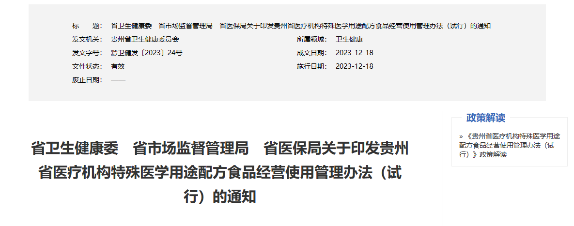 貴州省發(fā)布醫(yī)療機構(gòu)特殊醫(yī)學用途配方食品經(jīng)營使用管理辦法(試行)