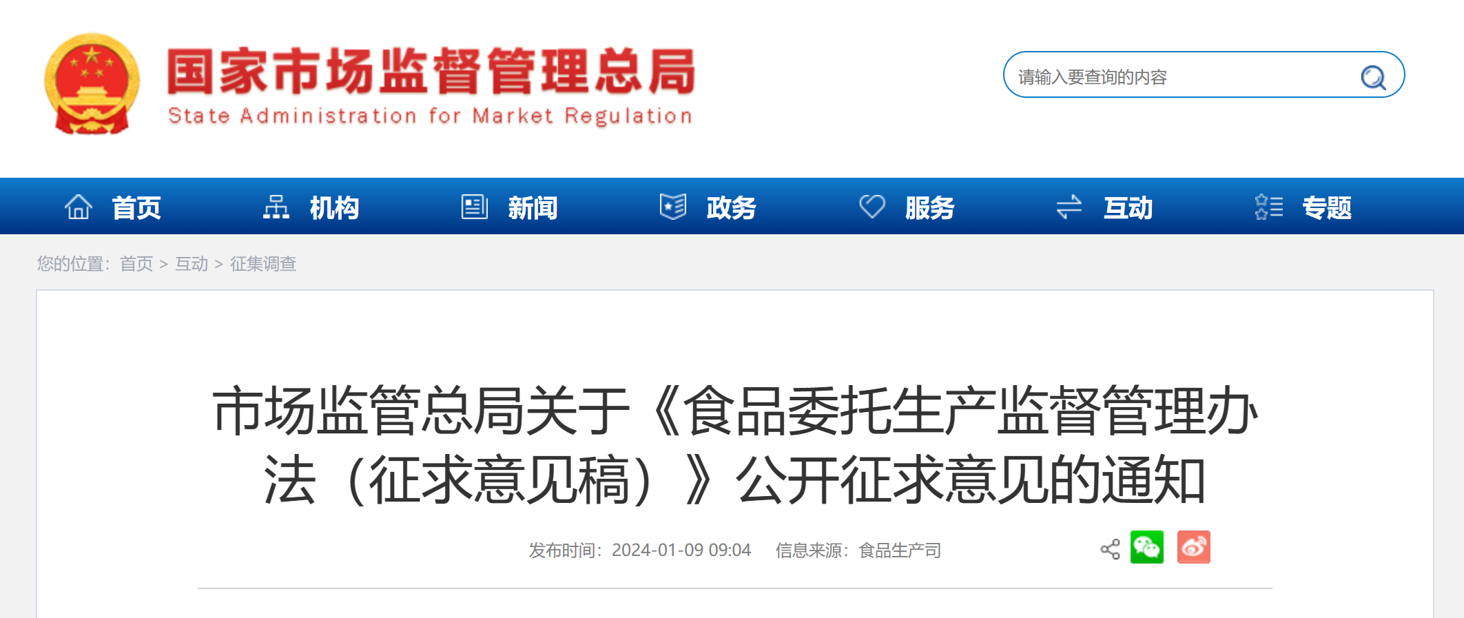 國(guó)家市場(chǎng)監(jiān)管總局關(guān)于《食品委托生產(chǎn)監(jiān)督管理辦法(征求意見(jiàn)稿)》公開征求意見(jiàn)的通知