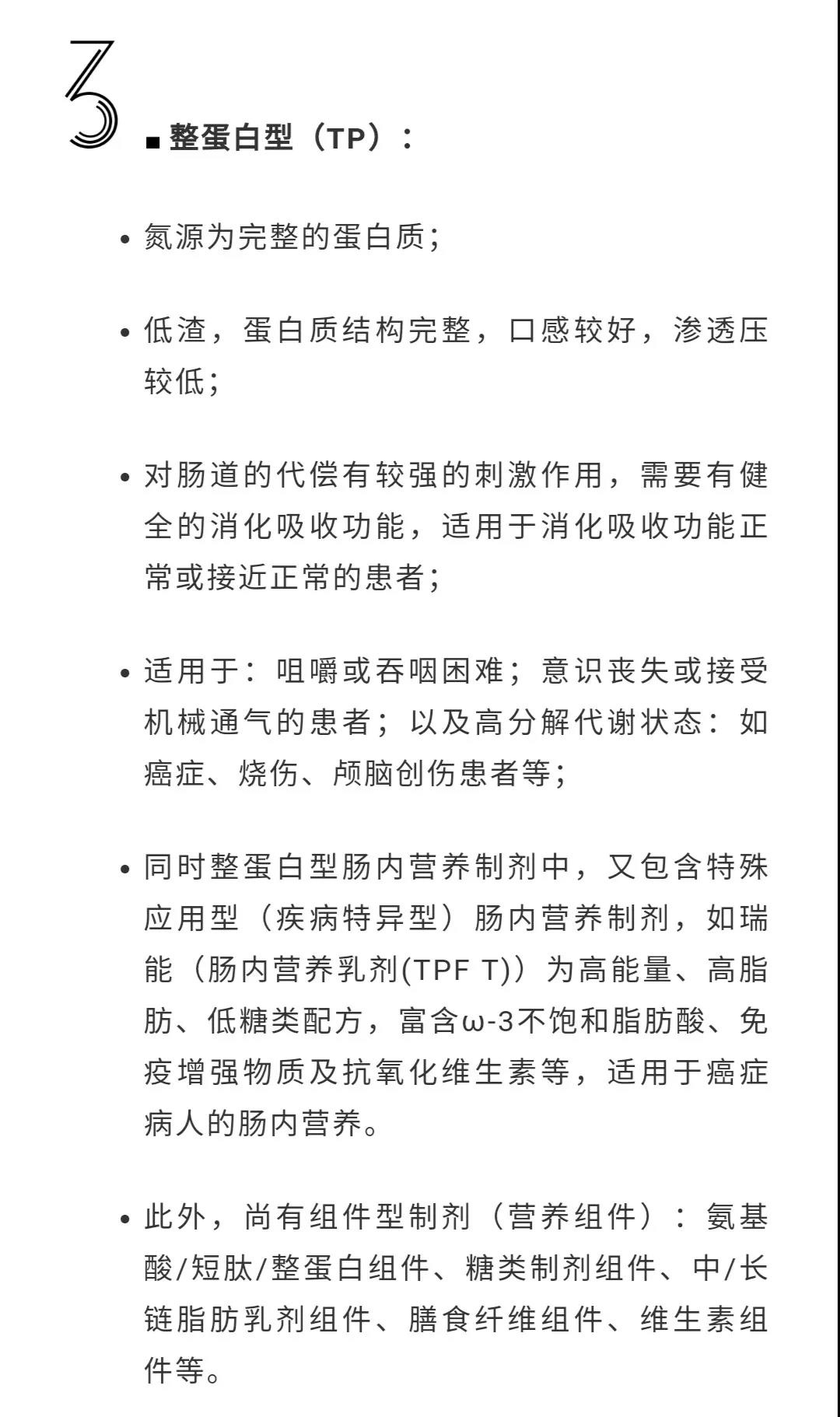 ② 胃腸道功能:胃腸道功能正常者應(yīng)選用整蛋白制劑,對于胃腸道功能低下者,如急性胰腺炎、克羅恩病、短腸綜合征患者等宜選用短肽型腸內(nèi)營養(yǎng)制劑。