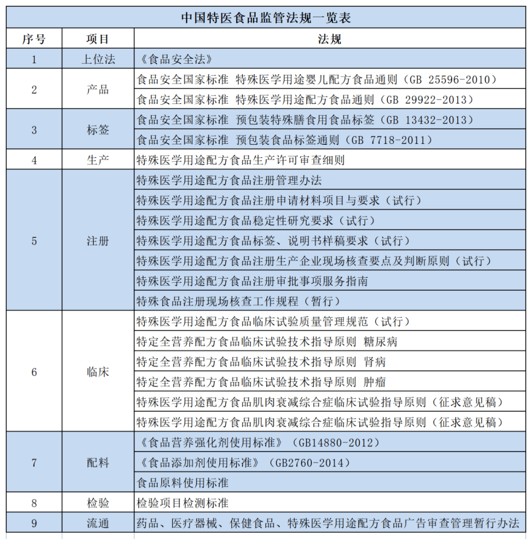 在我國,特殊醫(yī)學用途配方食品(下文簡稱為“特醫(yī)食品”)是一類起點非常高的食品,目前已構建起比較完善的法規(guī)標準和管理體系。特醫(yī)食品從產(chǎn)品標準、生產(chǎn)規(guī)范、臨床實驗評價、產(chǎn)品注冊、生產(chǎn)許可、經(jīng)營許可、標簽管理、日常監(jiān)督都有相應的法規(guī)要求。