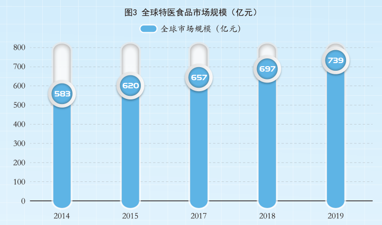 據(jù)統(tǒng)計,全球特醫(yī)食品從2014年的583億增長到了2018年739億元,每年增長超過6%。歐美國家因特醫(yī)食品發(fā)展較早,市場依然成熟,所以占了大部分市場份額。而我國目前市場規(guī)模僅占1.6%。與國外巨大的差距也預(yù)示著特醫(yī)食品再我國還具有巨大的發(fā)展?jié)摿Α?