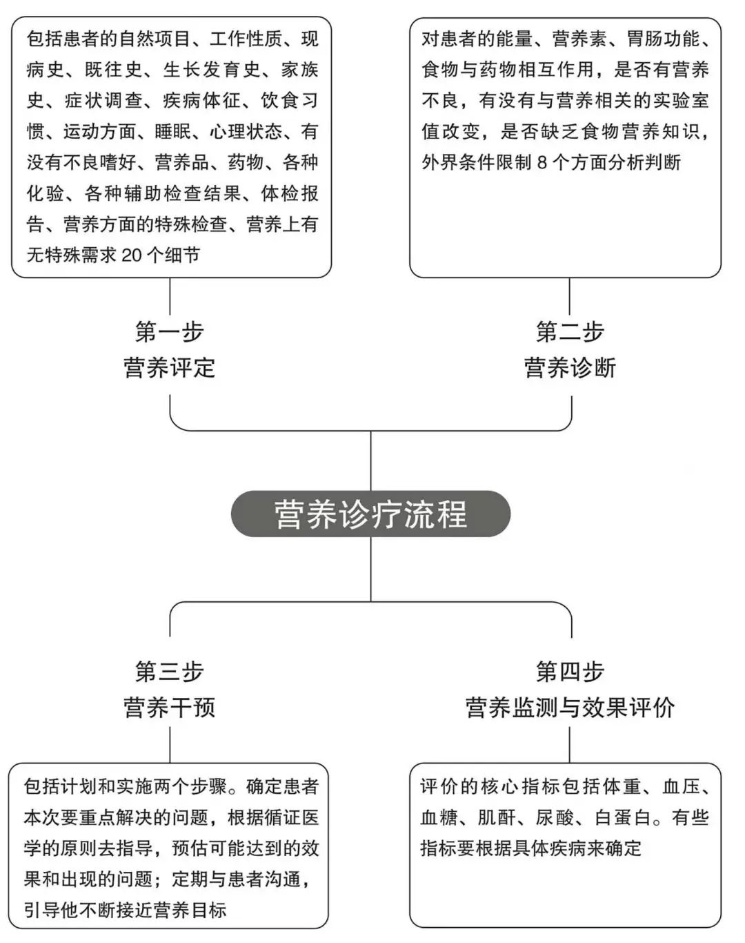 這個(gè)流程一共包括四個(gè)步驟:營(yíng)養(yǎng)評(píng)定、營(yíng)養(yǎng)診斷、營(yíng)養(yǎng)干預(yù)、營(yíng)養(yǎng)監(jiān)測(cè)與效果評(píng)價(jià)。